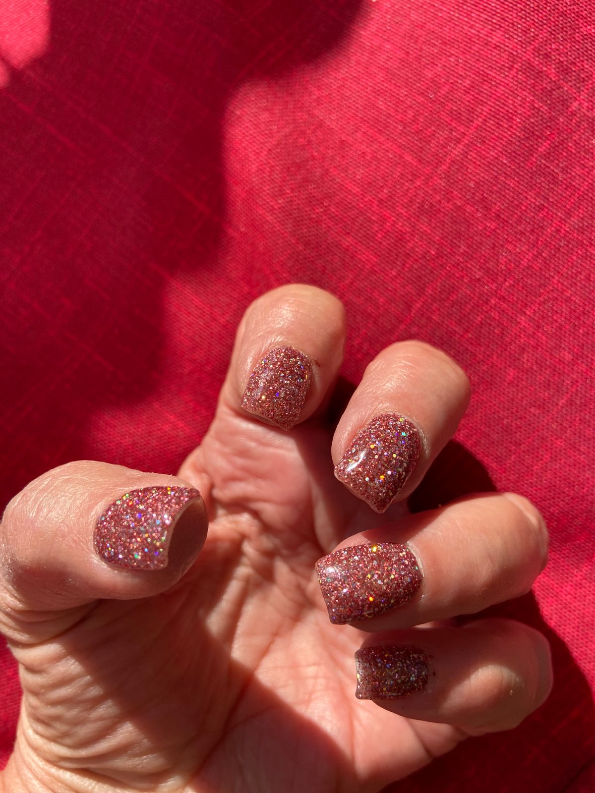 The only way to improve upon pink glitter is to add more glitter! We added holographic silver glitter to this rose gold glitter nail polish and the prismatic results will prove you’re a princess!