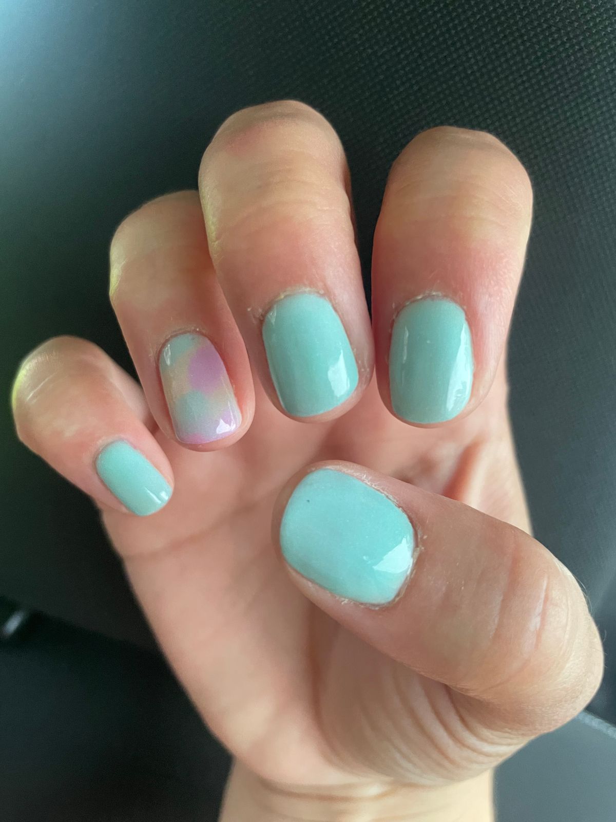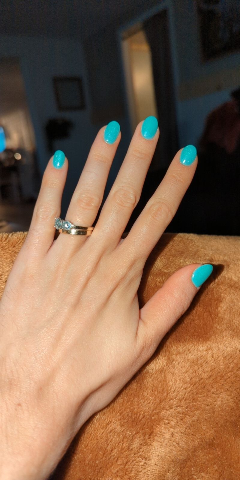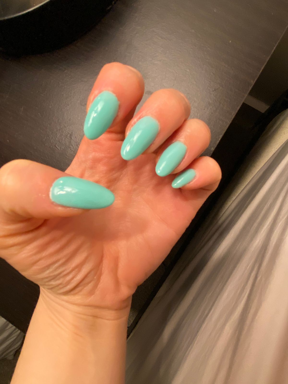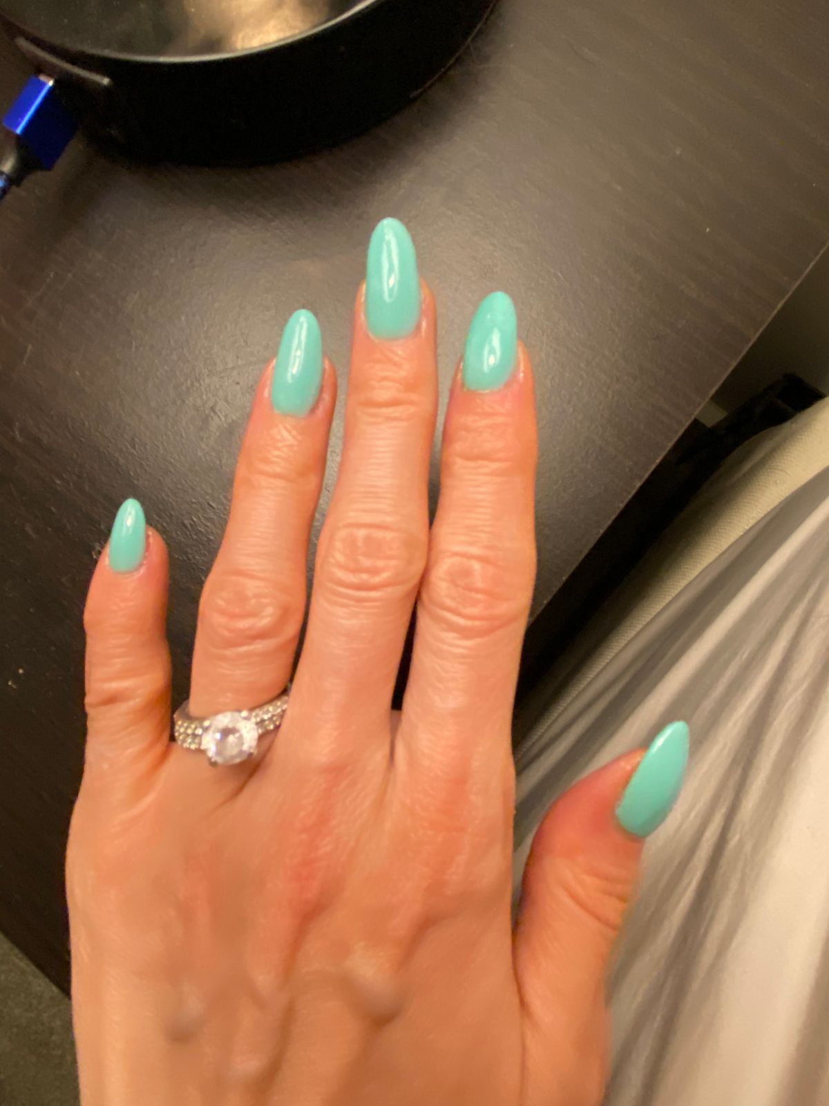 This is a gorgeous mint color with a very slight shimmer to it. Not like a full glitter, just a nice subtle sparkle. It comes out a bit more blue in my photos. I would say it’s more of a blue green mint color. Nice and pigmented, I could have gotten away with two coats but I did my usual three. Love it!