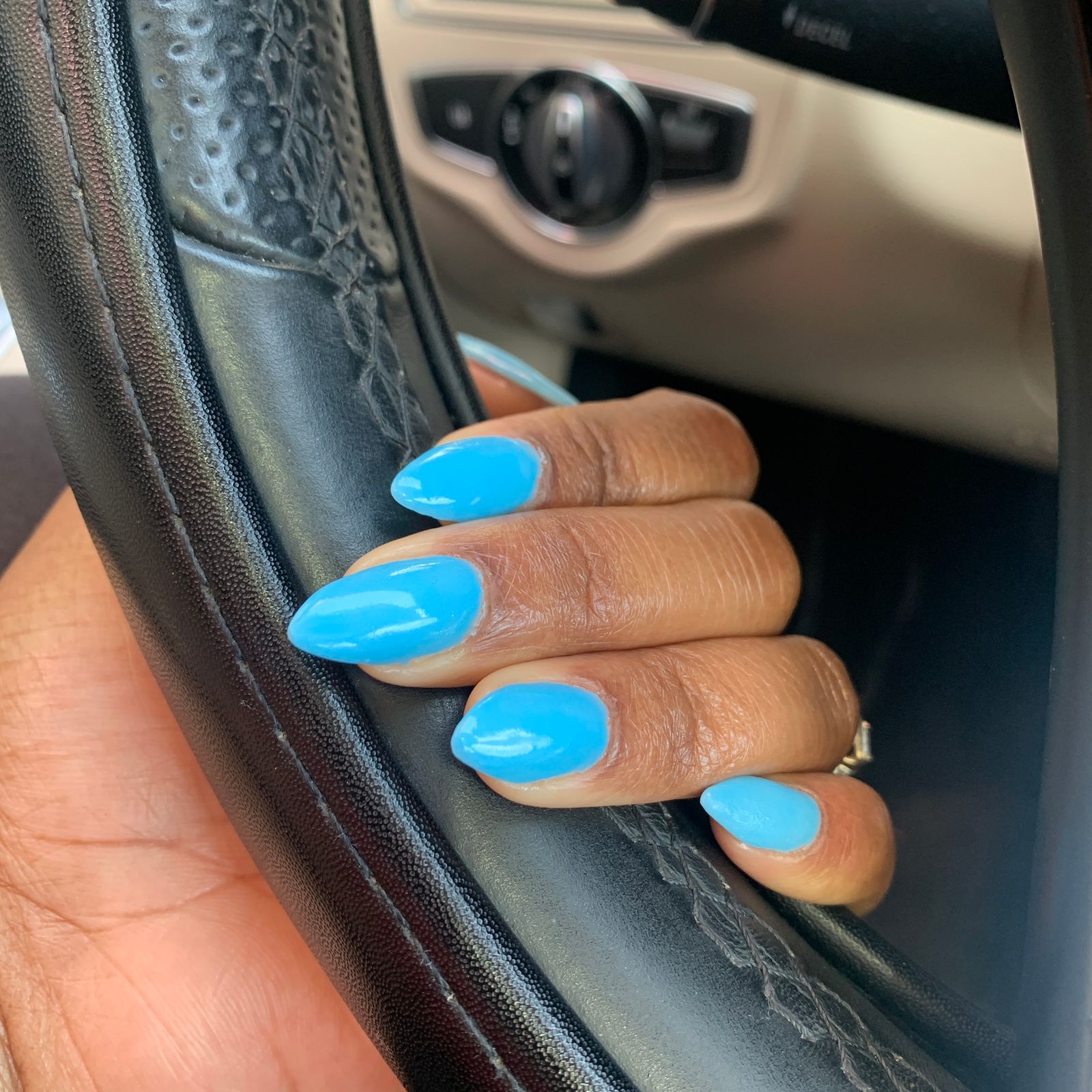 The color comes out as blue and is not over done. The picture is a little bit darker then what is applied on the nail.
