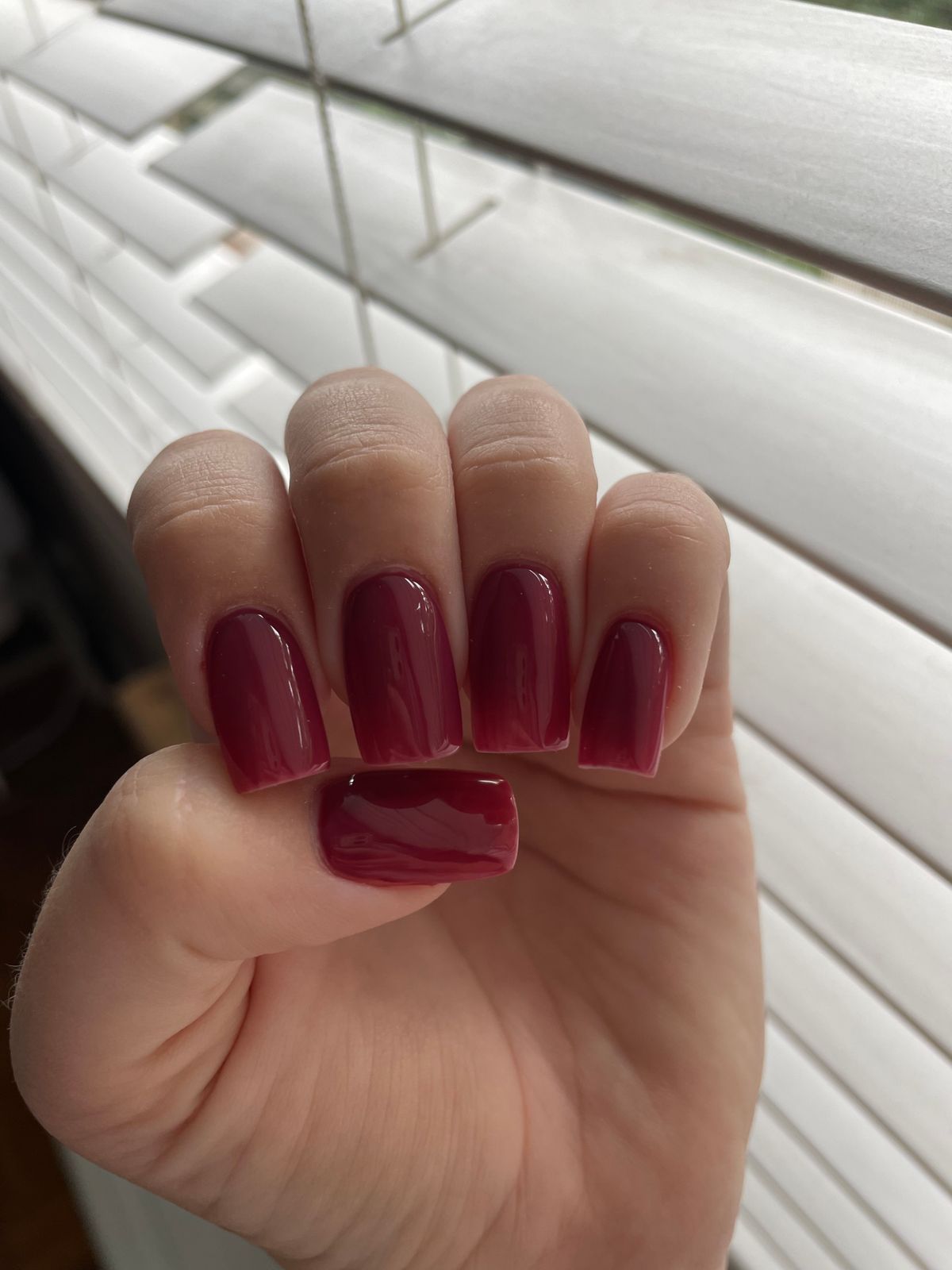 Very beautiful berry, burgundy color. Perfect for fall or a night out! I used three thin coats to get full coverage.