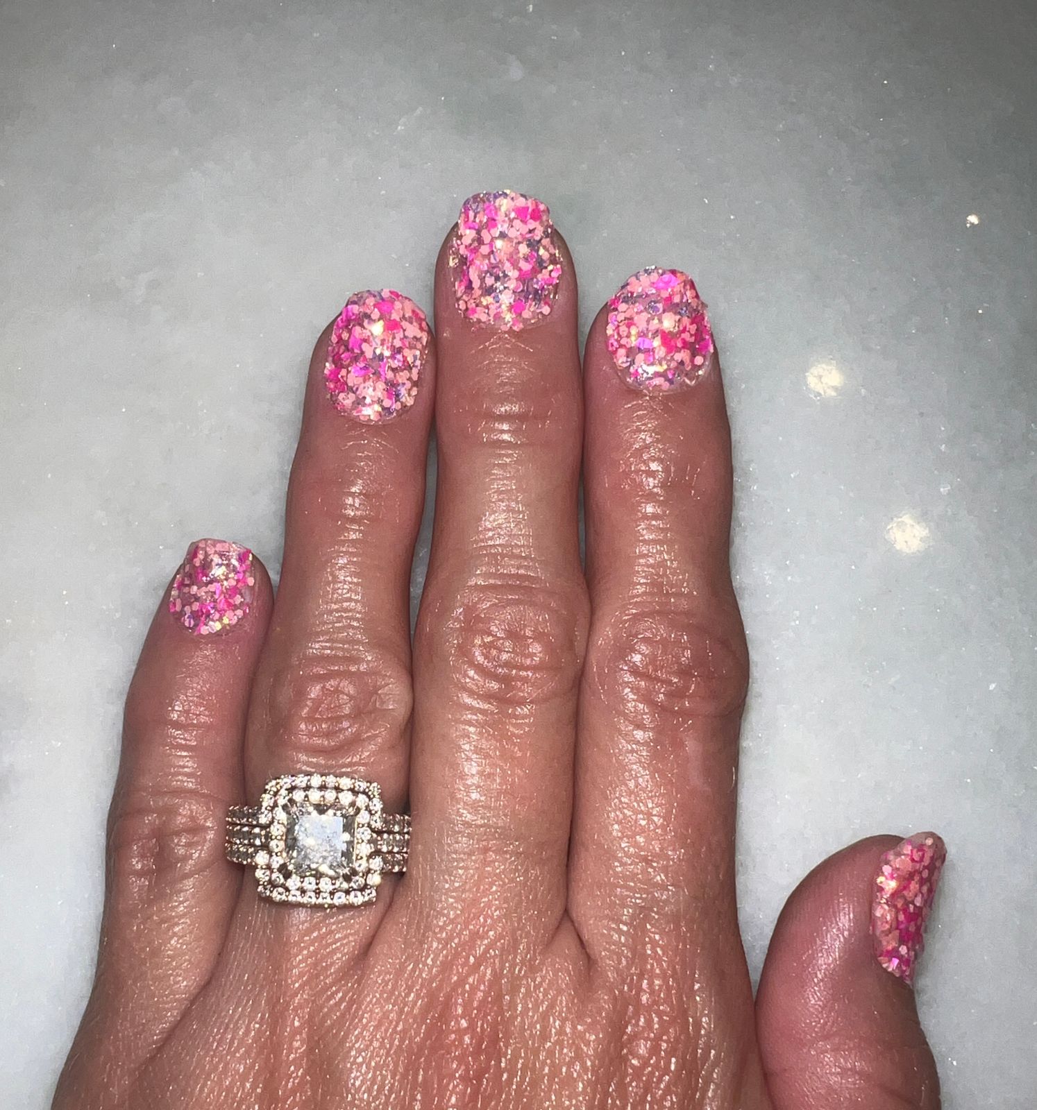 With matte baby pink glitter and hot pink strips, Sweet Talk is serving the same bubblegum princess look as your favorite Barbie. Mixed with just a hint of iridescent clear glitters for a bit of sparkle!