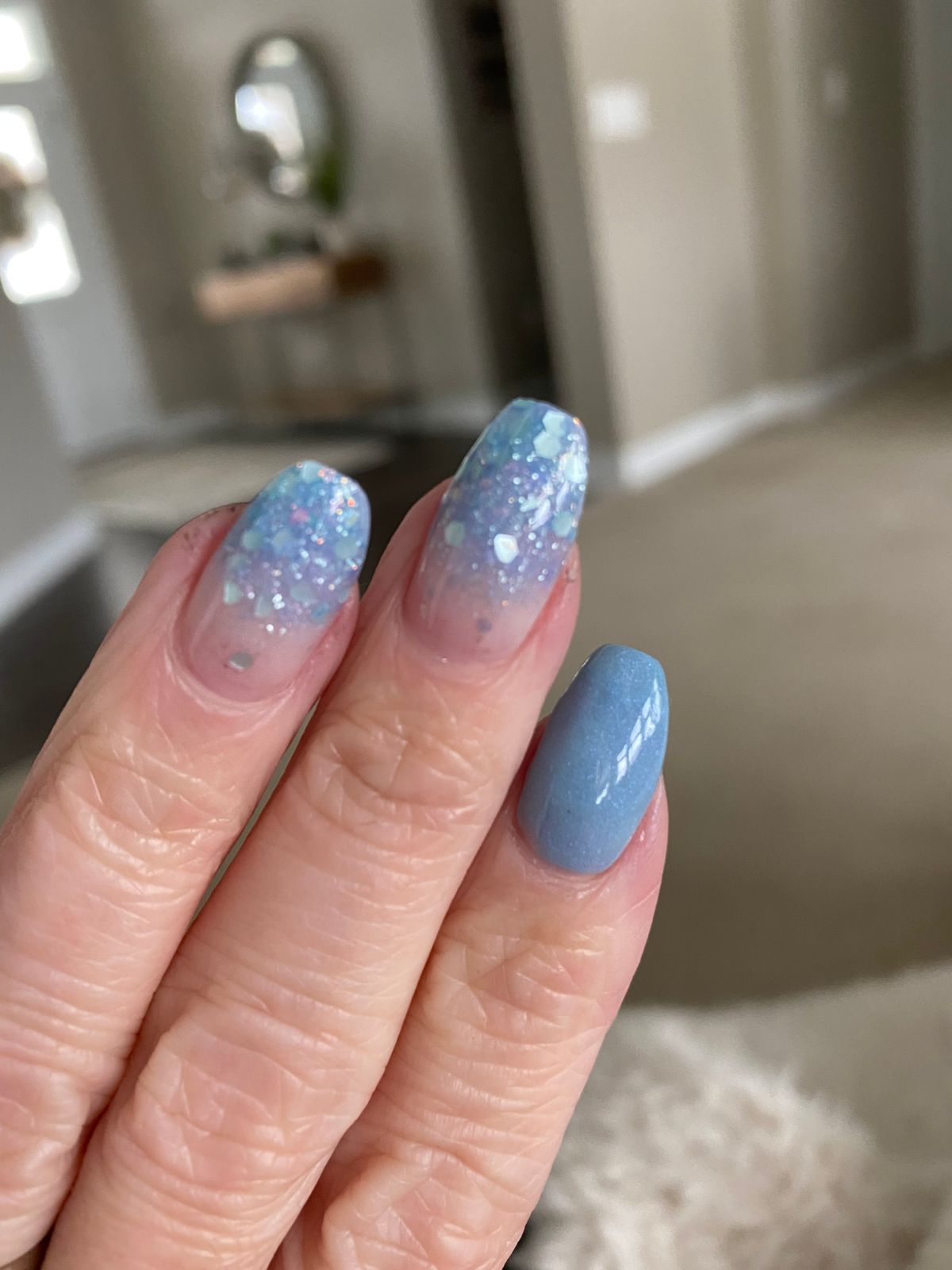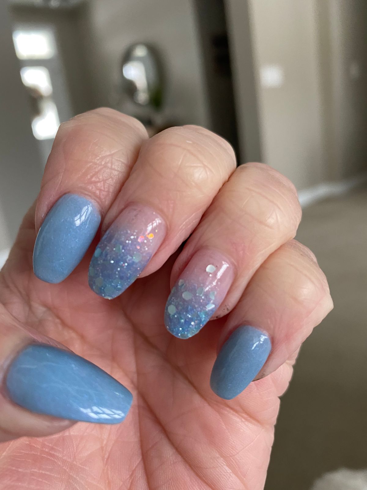 Beautiful light blue summer color. Reminds me of the clear water oceans. Great for glam nails or a classy set. My nails sparkleโจ๐ ๐ป Love Kiara Sky products, the bottles and packaging feel like luxury. Unwrapping my bundle felt like Christmas. Will definitely be coming back for more๐๐ ๐ป
