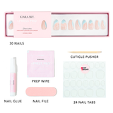 It's time to make a splash! With pastel blue swirls and subtle white accents, "Ocean Waves" will have you looking like the cutest babe on the beach. This short almond nail set has the perfect sandy nude color as a base and unique swirl designs on each nail, to give you a unique and customizable look! Apply with acrylic, nail glue, or tabs and get long-lasting, salon-quality nails in minutes.