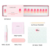 'Pink Skies' is a short coffin ombre set that transitions from a bright neon pink into a subtle nude cover color base. This matte ombre set goes great with any outfit and is a must-have look, especially for those who love shorter nails! Apply with acrylic, nail glue, or tabs and get long-lasting, salon-quality nails in minutes.