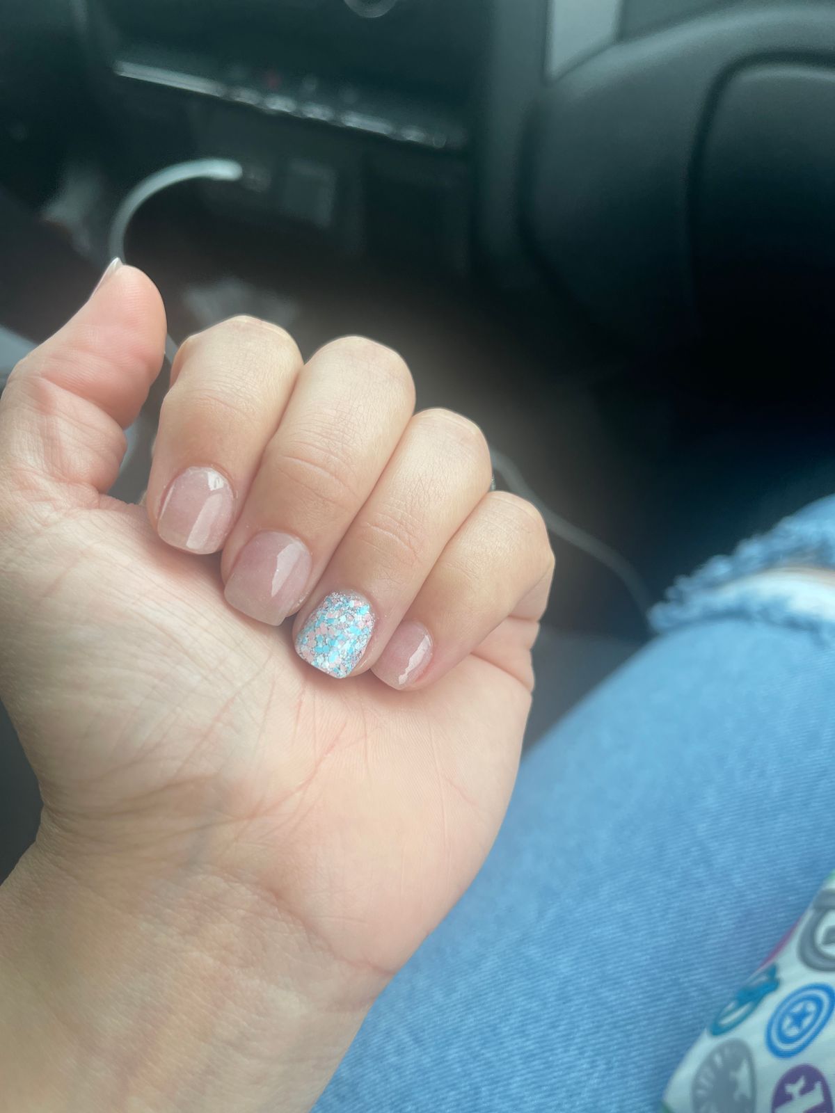 Beautiful dipping color! Very pleased. My 6th color and I love them. The woman who does my nails loves it too. This one comes out baby blue with pieces of matte deep pink and silvery glitter. Really pretty. Hardens really great and strengthens my nails, never chips.