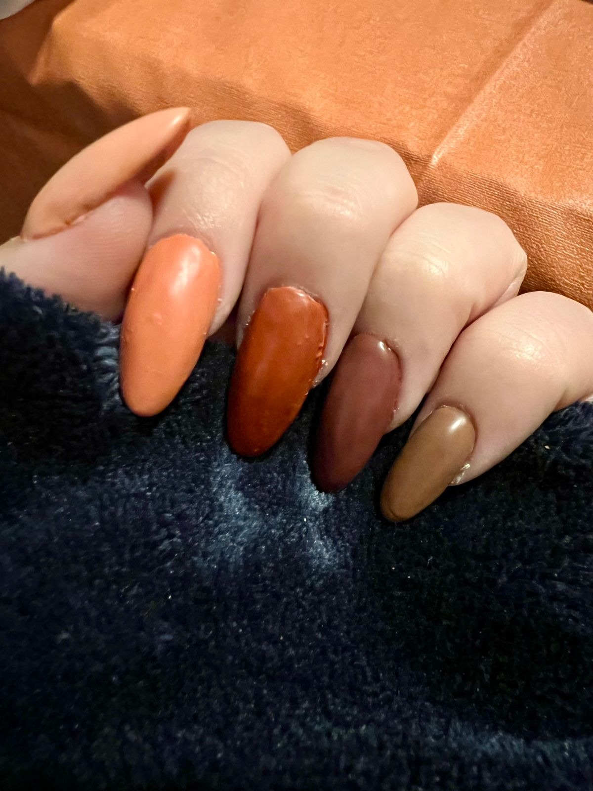 Applies nicely with good coverage. Beautiful color! (Index fingernail in photo). Perfect for autumn.