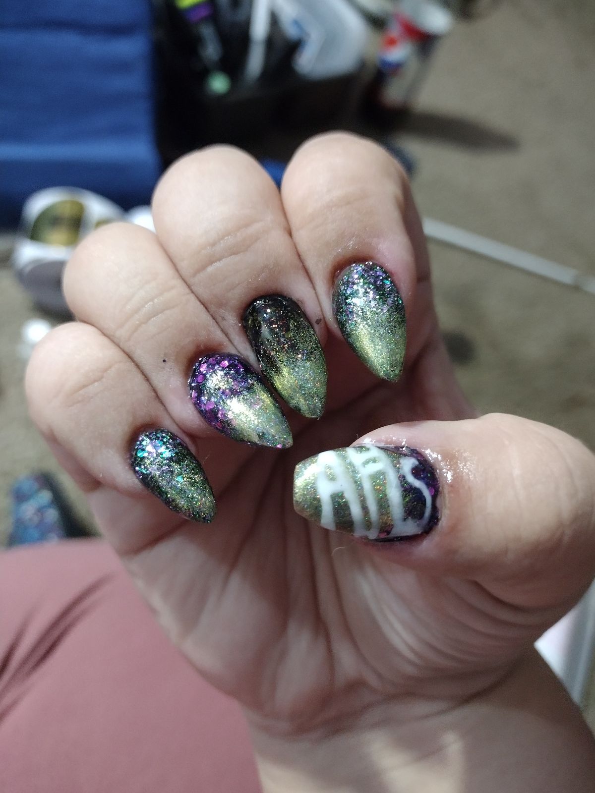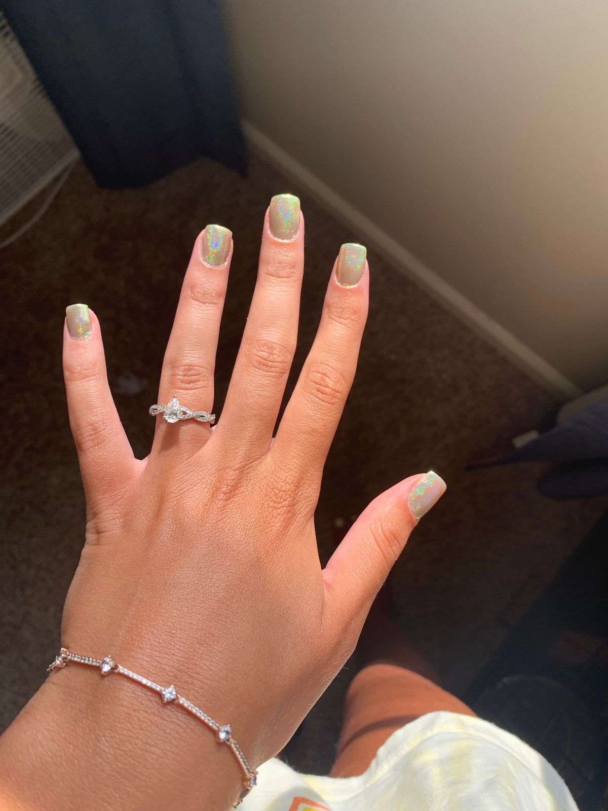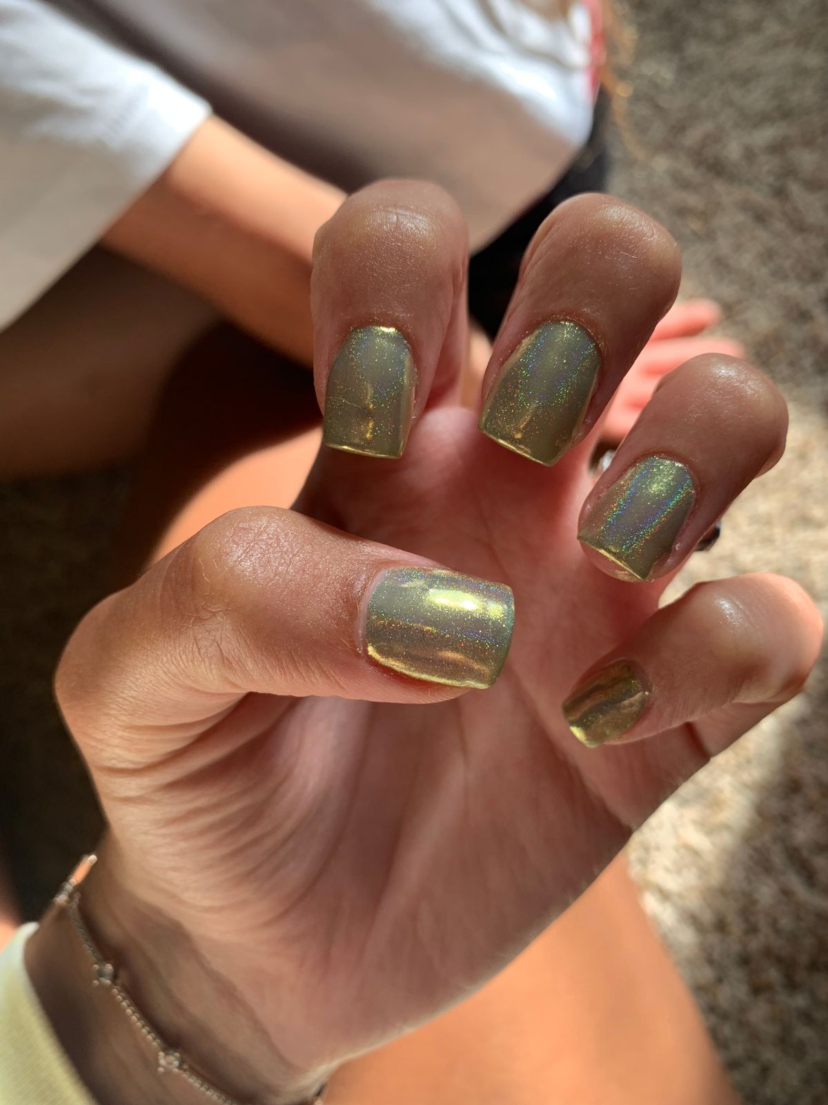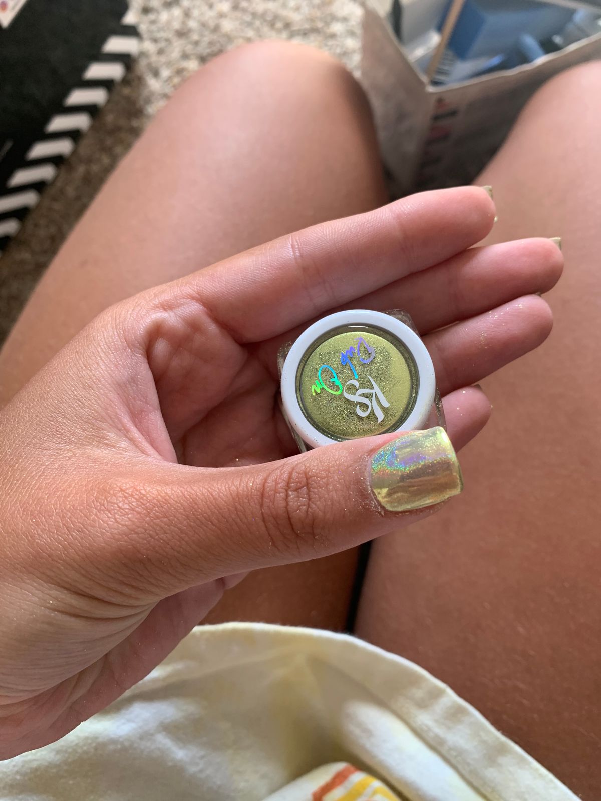 i love this rub on powder! so easy to use and very holographic. you have to apply it on top of a gel top coat for it to stick though. the container was smaller than i hoped but you don’t need much of the powder to get good coverage. i just applied it over a clear gel top coat with no gel color underneath.