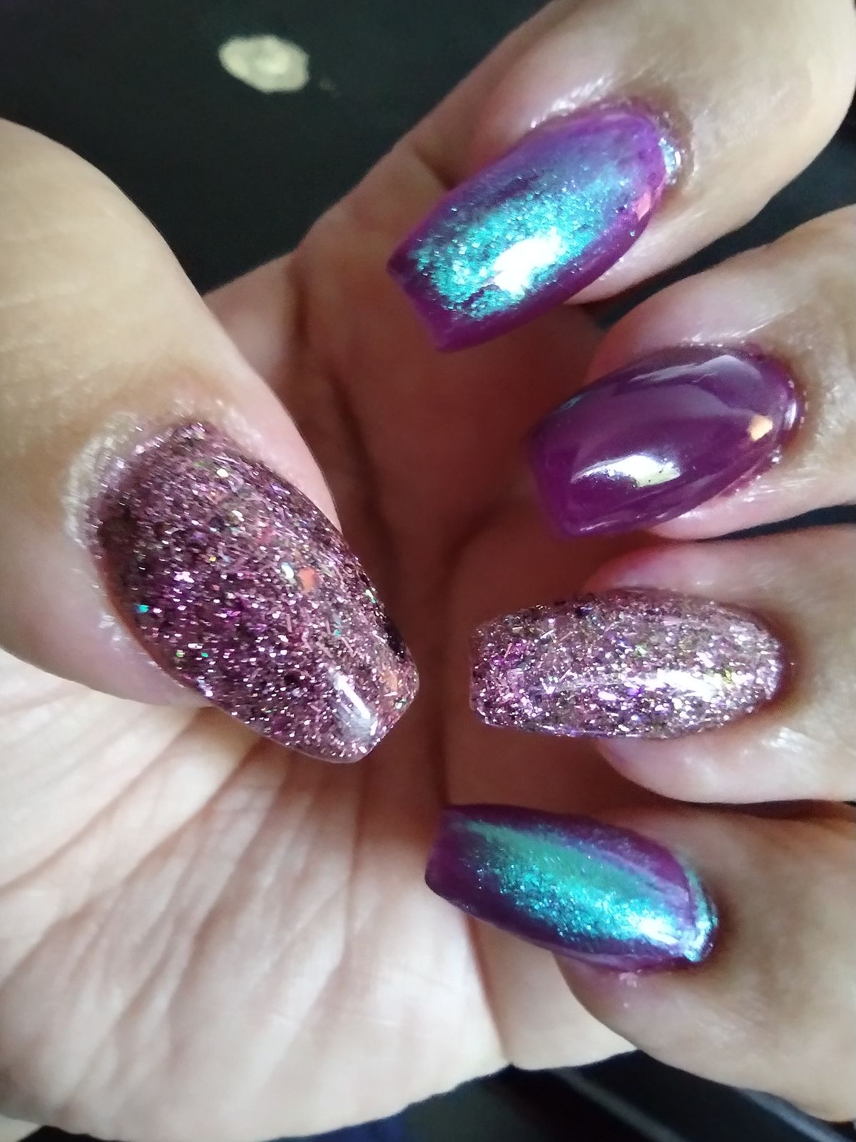 I love many of the rub on chrome colors; however, Mermaid has stolen my heart with its delightful play of teals and pinks! I decided to try it out on top of Boujee Beige and Pink Parade Acrylic Powders, and it is absolutely magnificent! So in love!