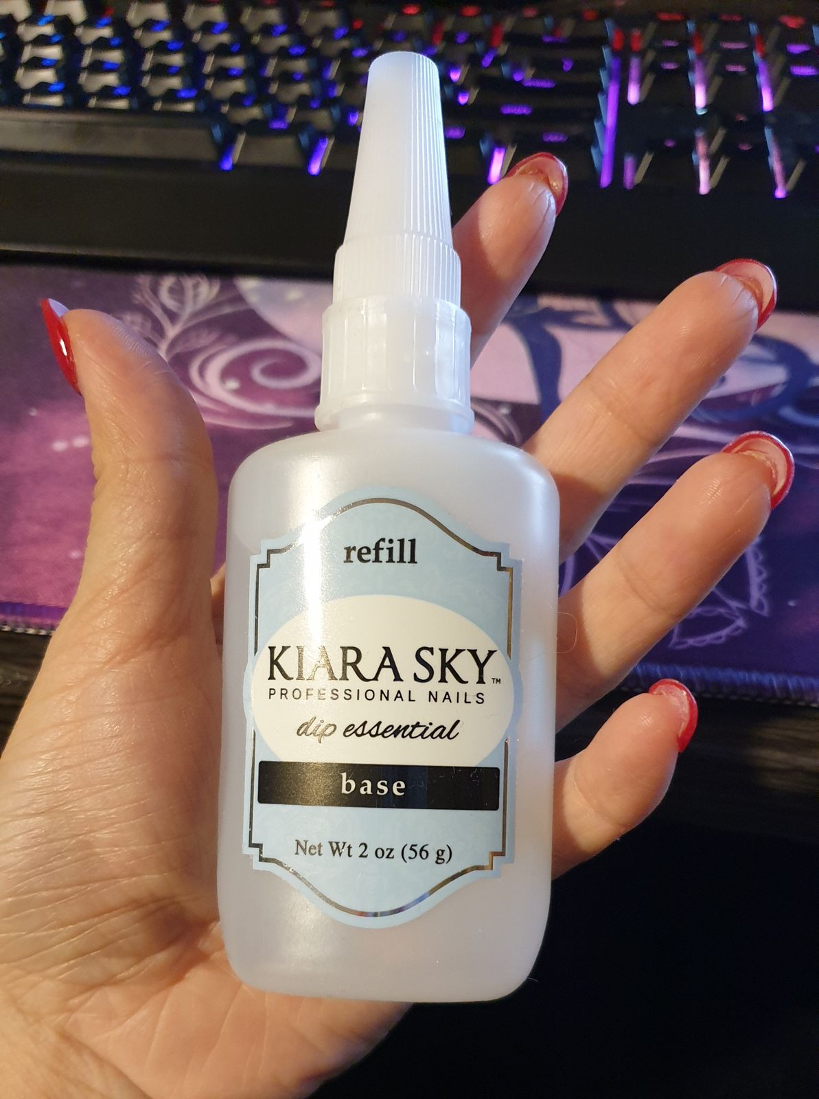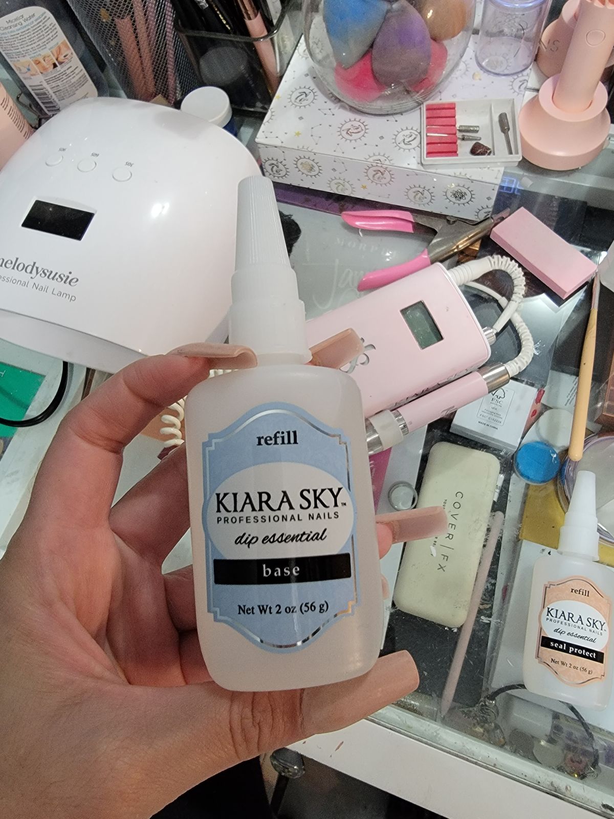 #2 Base: The second step in our system is our Kiara Sky dip base glaze. This is used before dipping in powder; our base glaze allows the powder to adhere to the area applied and maintain long lasting wear. This 2oz refill bottle has an easy-to-use cone spout that makes refilling dip essential bottles easy and mess free.