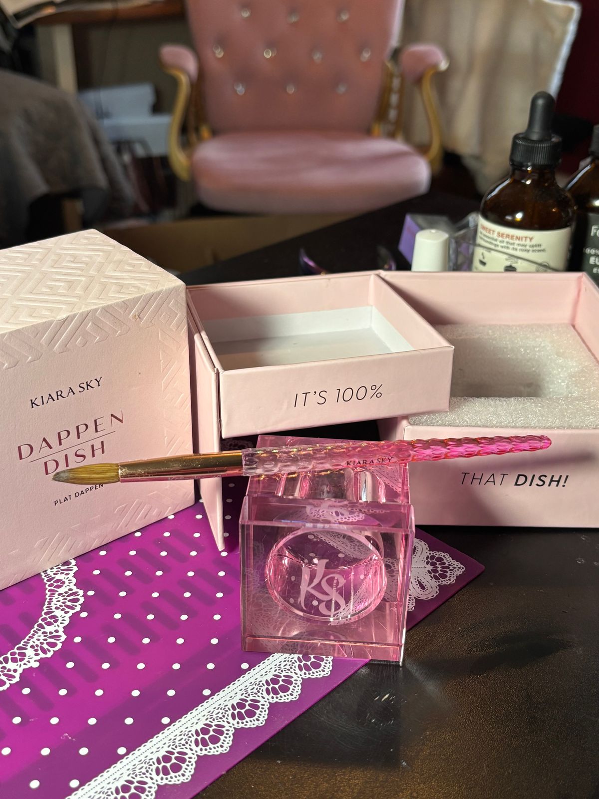 Upgrade your nail space with the gorgeous Kiara Sky Dappen Dish! Spill-proof and dip-ready the KS glass Dappen Dish is the perfect size and specifically designed to work with your monomer necessities. With this dish you'll avoid cross-contamination, contain odors, and keep your liquids from evaporating. The only Dappen Dish you'll ever need!