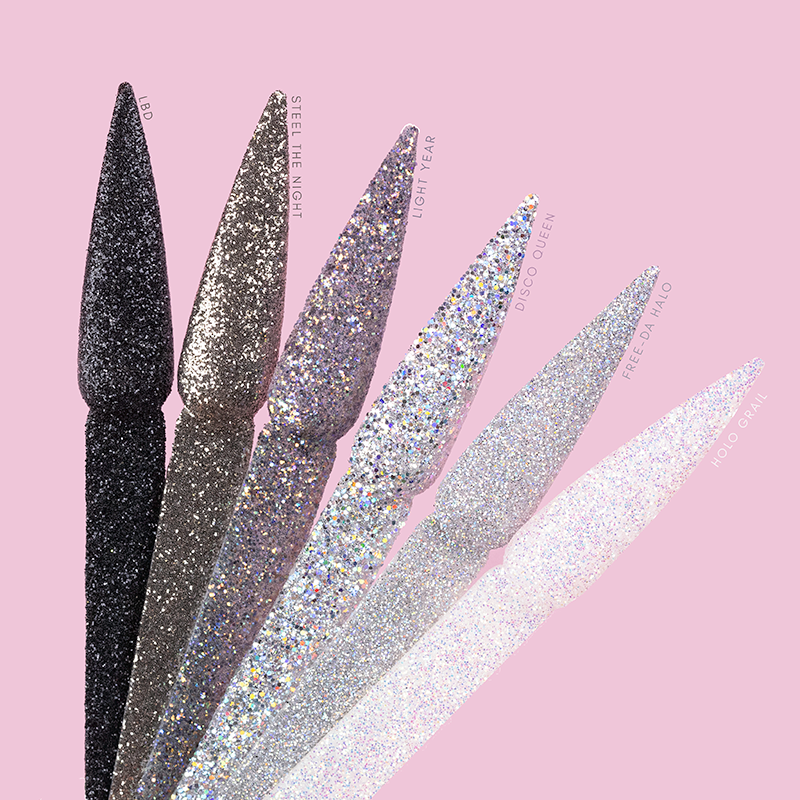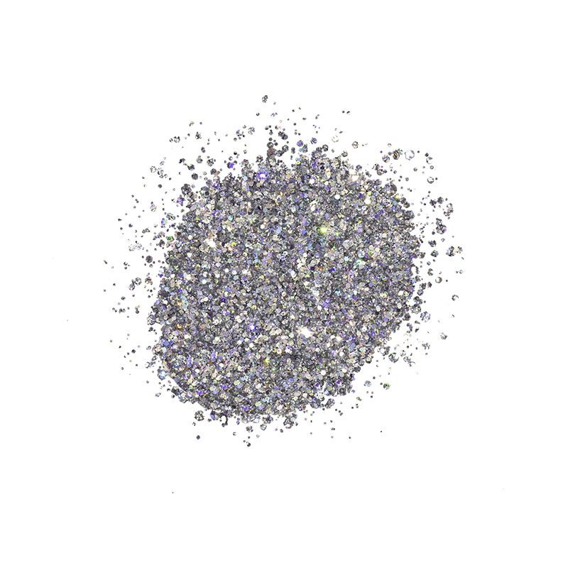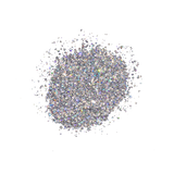 A psychedelic platinum glitter featuring iridescent flecks, perfect for a night at the discotheque.