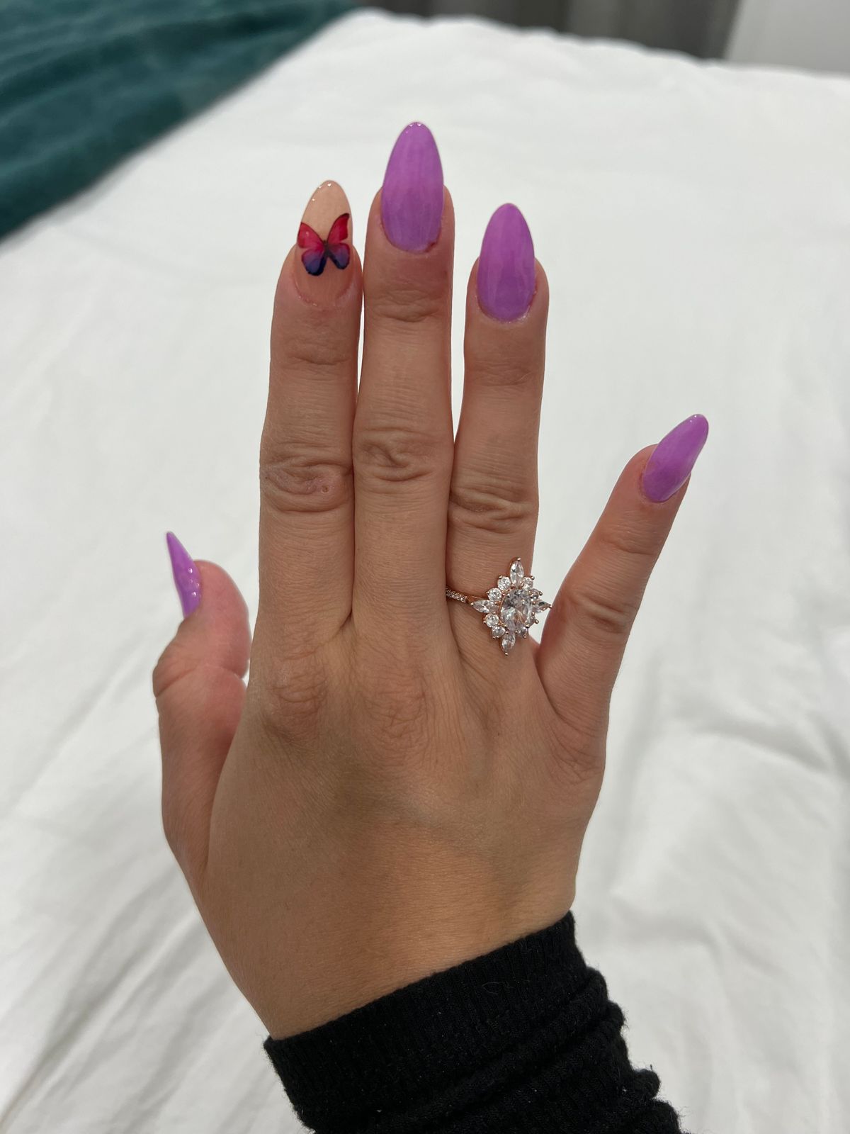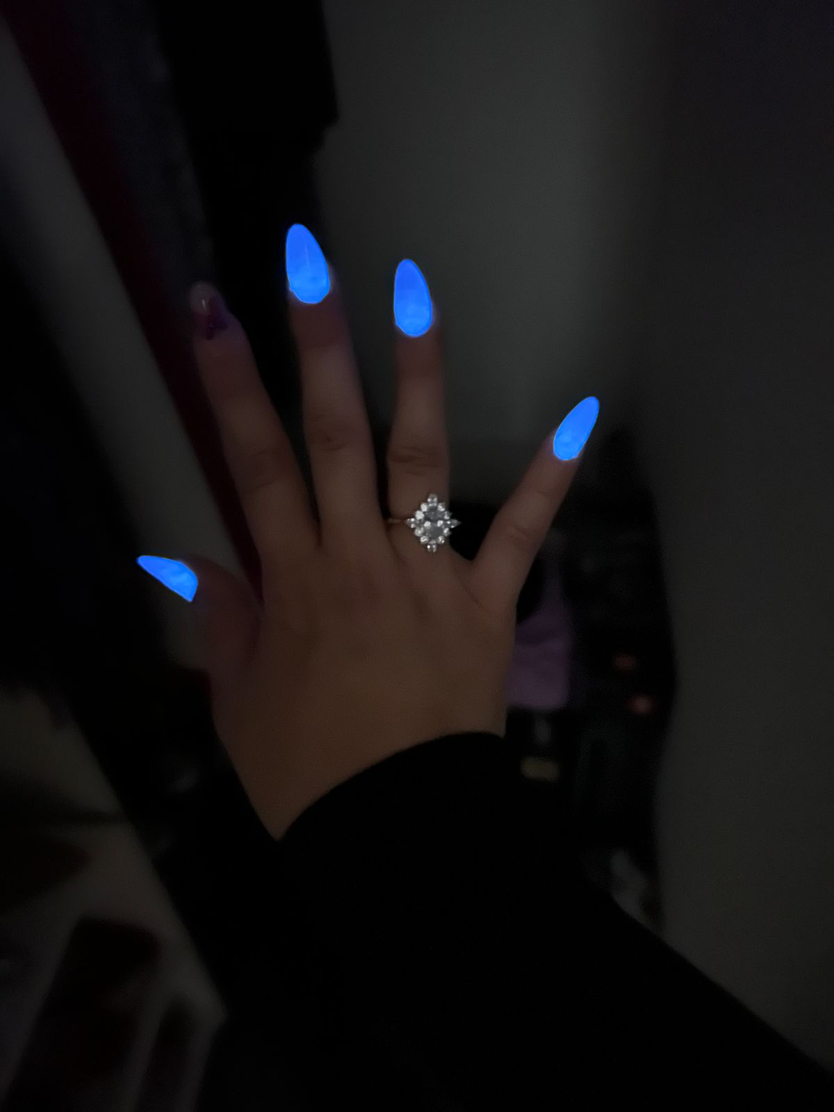 Pretty & darker than d’lilac dip powder. (I was a tad bit worried it’d be too similar) I’d say the nail swatch in the picture is pretty spot on! I love how this glows blue! How fun! With the KS glow dip powders you do have to charge the powder w/ uv or any type of light / sunlight. The more you wear it the better it’ll glow!