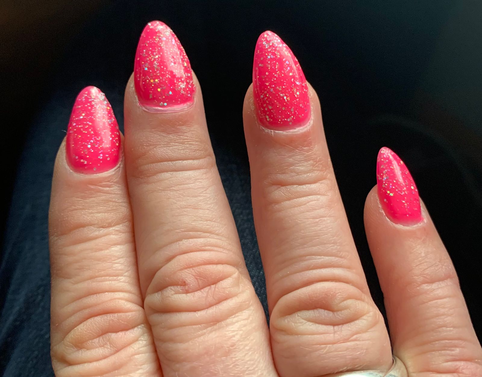 I used Time for a Selfie over the top of Pixie Pink! Absolutely love the way it came out. I put on 2 coats for extra sparkle. This is totally clear with the sparkle/glitter. Love the consistency and that the sparkles do not all bunch up when applying.