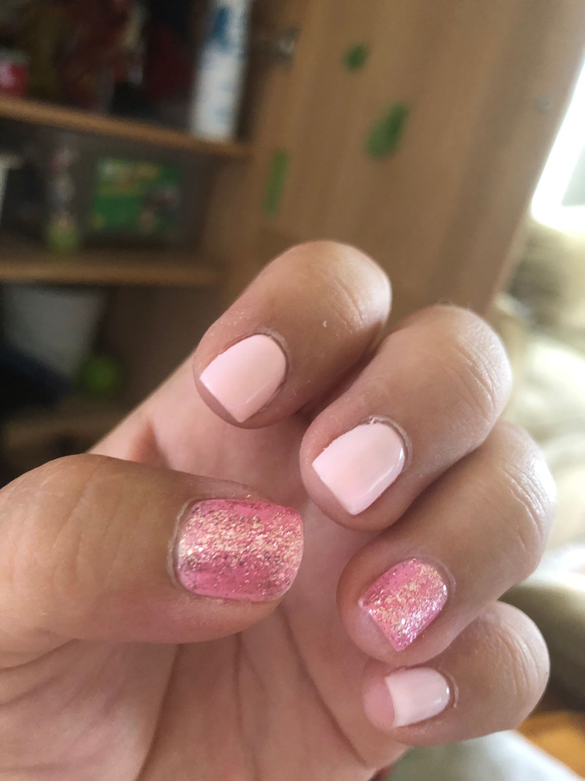 Such a pretty color-a very pale pastel pink. Definitely a pink but the palest you can go before it starts to ge questionably white. Very versatile-love it. It did take me 3 coats but this also my first time doing my own gel polish. The sparkly color is Flower Power over the Simple Life. In this picture seems a little darker than in other lighting or in real life.