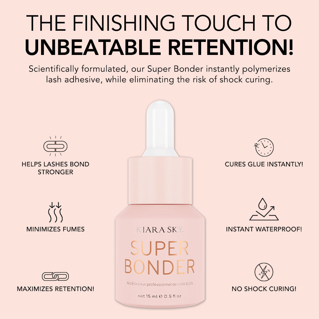 The key to unbeatable retention! Kiara Sky’s Super Bonder is the ultimate finishing touch to maximize retention on any lash set! Scientifically formulated, our Super Bonder instantly polymerizes lash adhesive, while eliminating the risk of shock curing. It prioritizes client comfort by dramatically reducing fumes and sensitivity, all while adding elasticity to your glue, resulting in less breakage and better retention. Not only are your clients able to wet their lashes after treatment, they will also experience weeks of retention like never before! This is the #1 must-have for your lash kit!