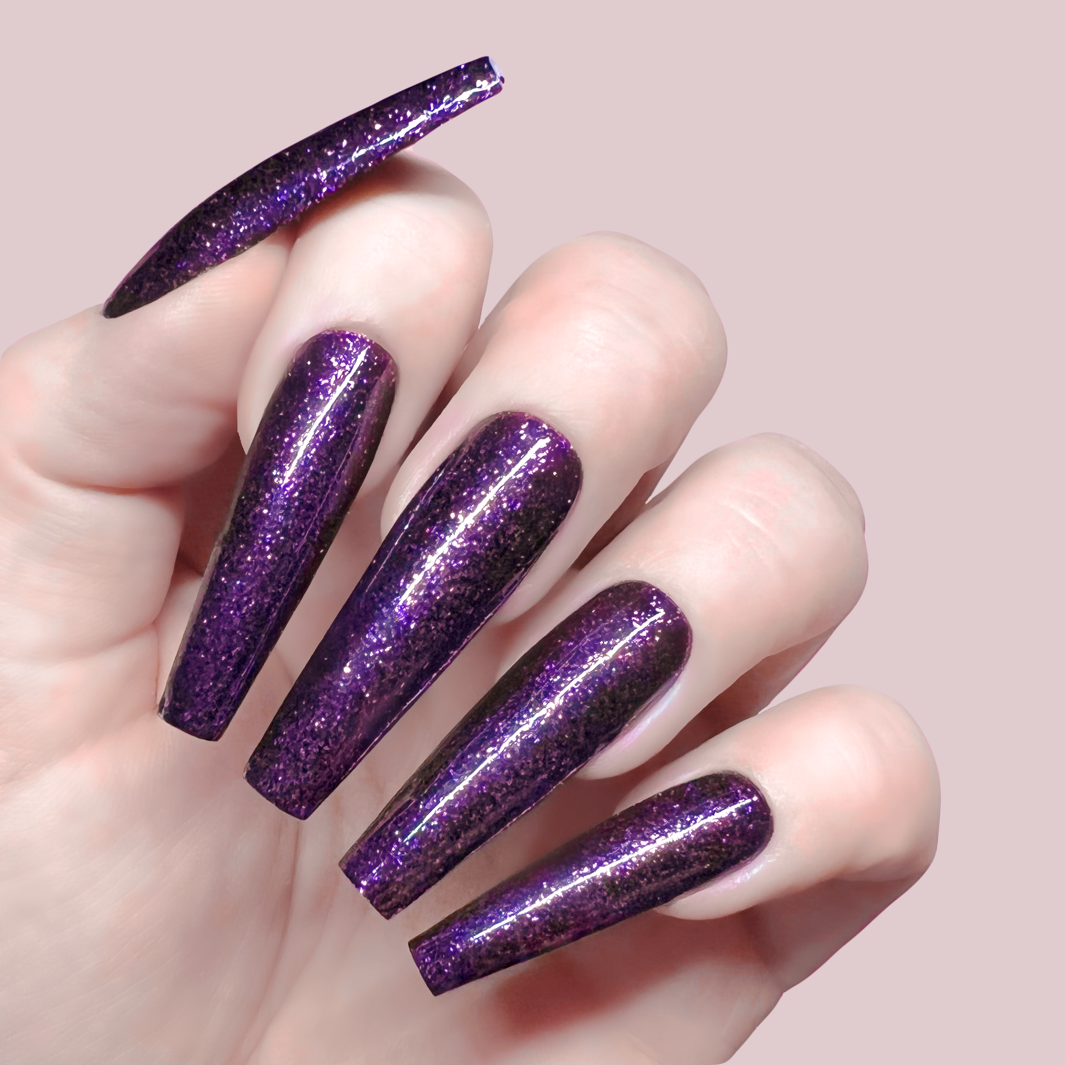 Deep violet jewel tones offset with flecks of amethyst set the scene for this mesmerizing Night Sky. Paint on a dazzling foil effect on your nails without the extra steps and with all the shine! This highly-pigmented formula is perfect for one coat coverage and nail art!