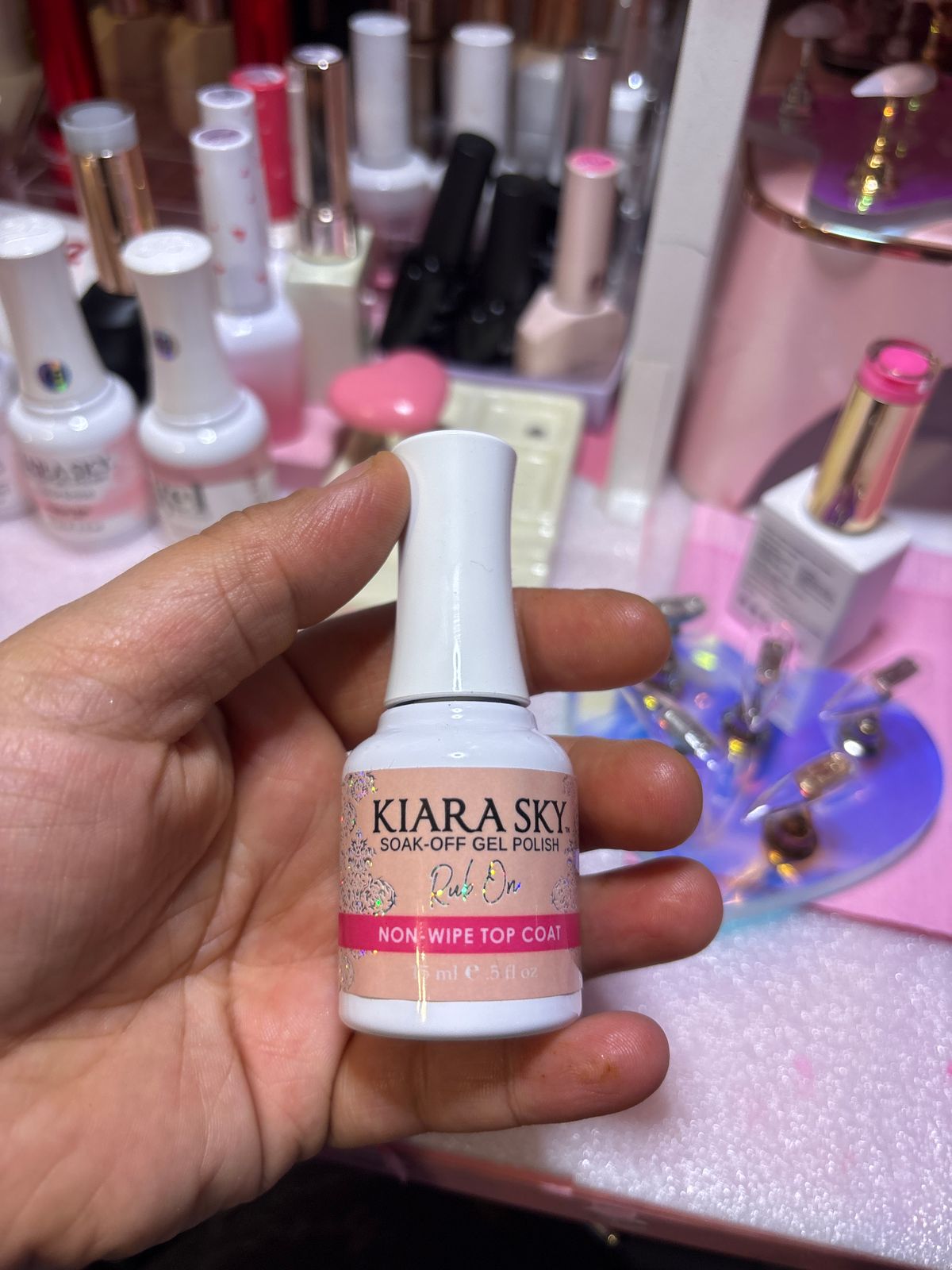 "Apply this Non-Wipe Gel Top Coat on your base shade, cure for 60 seconds under LED and 2 minutes under UV and rub on your favorite Kiara Sky Holo, Chrome or Mermaid Powder! Then, apply the Rub On Non-Wipe Top Coat to the nail and cure for 60 seconds to complete the look!"