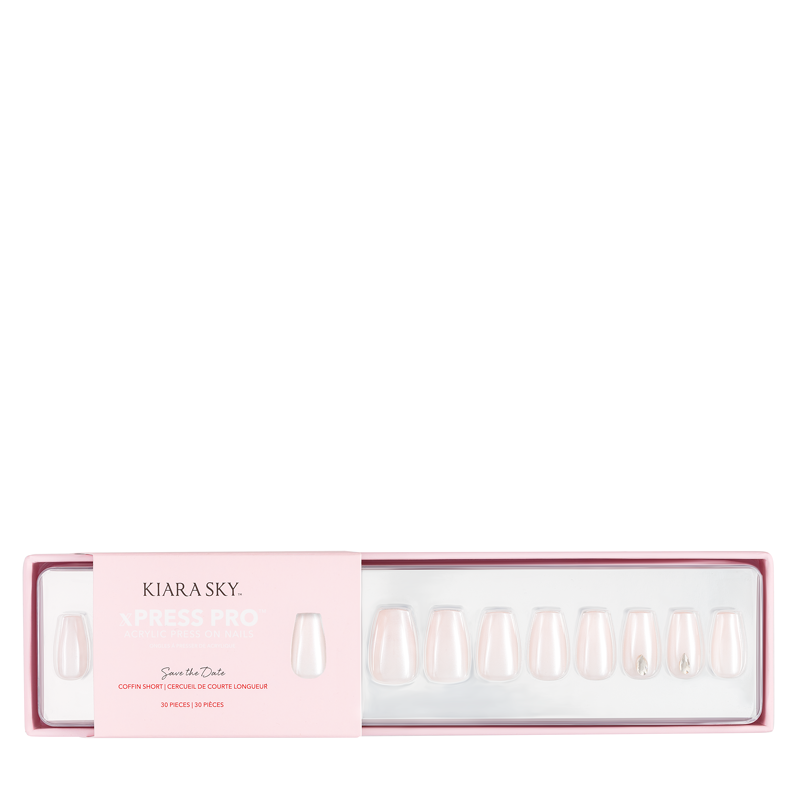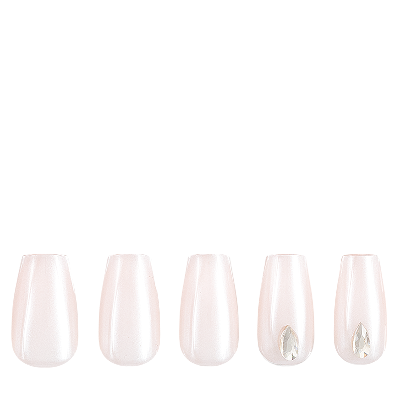 Don’t forget to 'Save The Date' because your nails are ready to commit to this manicure. This romantic short coffin nail set features a barely-there pink color with a shimmery white pearl finish and a sparkly jeweled accent nail. Apply with nail tabs, acrylic, or nail glue and get long-lasting, salon-quality nails in minutes.