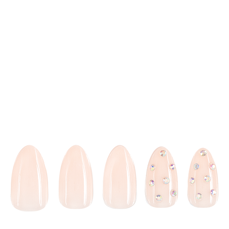 With a "Subtle Hint" of pizzazz, this classic nude set is a simple, yet memorable look. These short almond nails are created using a pale nude cover color and feature a bedazzled accent nail with sparkly diamond-like rhinestones. Apply with acrylic, nail glue, or tabs and get long-lasting, salon-quality nails in minutes.