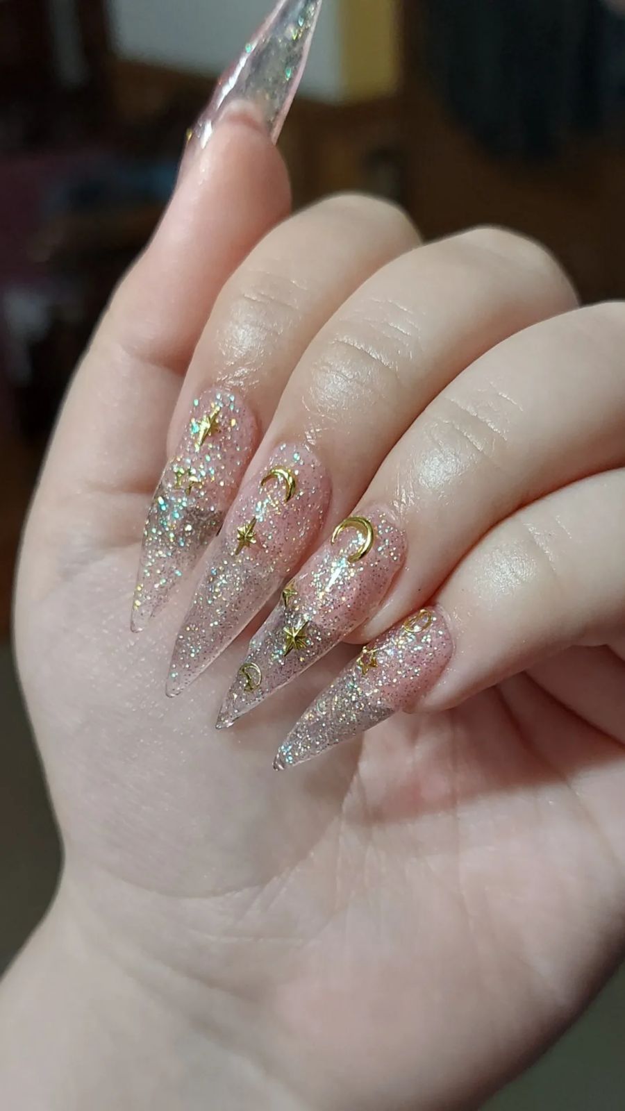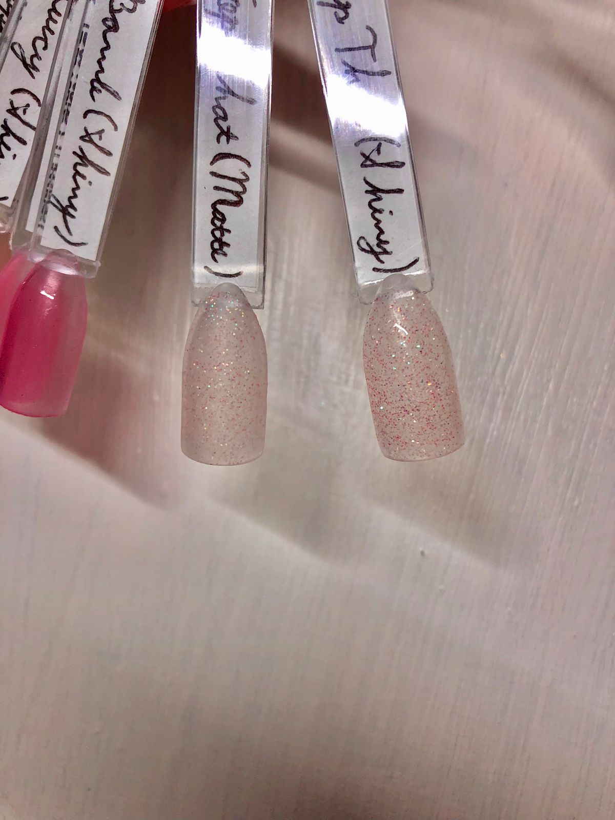 i havent had a set that ive been so excited for until i bought this powder. its perfectly sheer, smooth to work with, and just overall a beautiful colour. its a medium pink tone with green/blue/yellow reflective glitters, along with dark pink flecks as well. its recommended to use a matte top coat for a sea glass effect, and for any other acrylic this may be true, but you would be doing yourself a disservice by not using a glossy top coat - its just so beautiful and glassy and glittery that way.