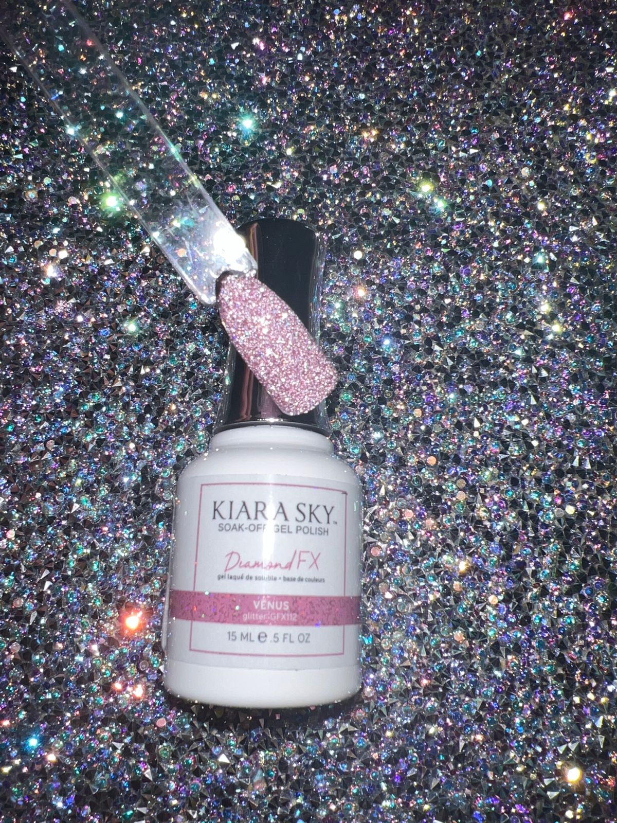 "The Kiara Sky Diamond FX Gel Collection was born to shine! 12 NEW reflective glitter gels with a diamond effect unlike any other. Featuring our signature long-lasting Colorbase formula, mixed with an infinite amount of ultra-sparkly KS Diamond Dust that transforms into a reflective illusion when the lights go out! Show off your crushed-diamond mani during the day, and flash your lights at night for the coolest reflective glitter nails you've ever seen!"
